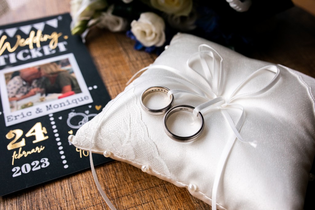 Ze is rustig. Het huis is nog stil. We starten de dag met een goede kop koffie en praten bij over onszelf en over wat komen gaat. Ik voel me dankbaar. Want dit is een bijzondere dag: mijn allereerste bruiloft als fotograaf. Eric en Monique geven mij vandaag hun vertrouwen. Op tafel staan de ringen al klaar, en ook het boeket. Stilte voor de storm.