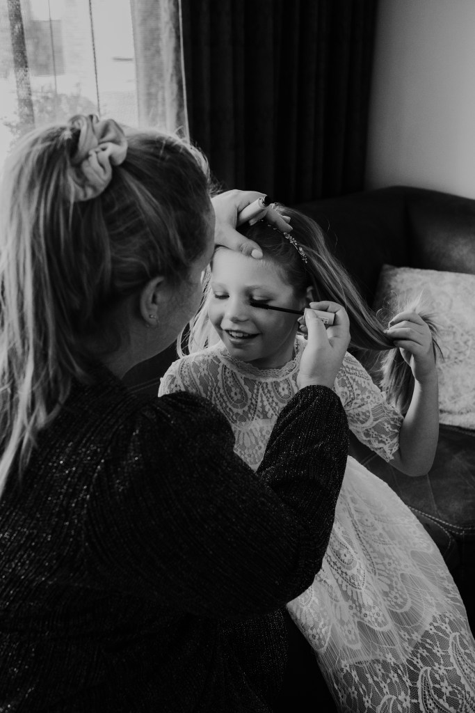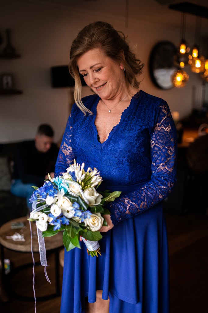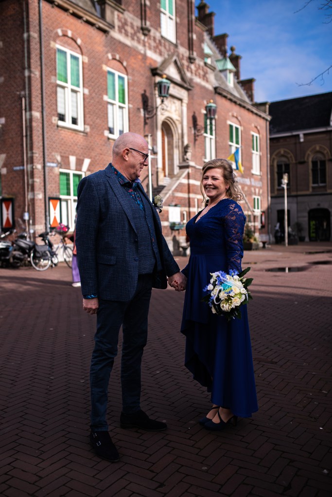 Terwijl de dames in de make-up zitten, wordt de prachtige blauwe trouwjurk aangetrokken. In de tuin maken we alvast wat foto’s en worden de corsages opgespeld. Met een laatste glaasje wijn is het tijd om te vertrekken naar de binnenstad van Purmerend. Tijd om te trouwen!