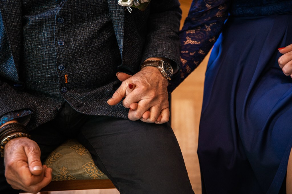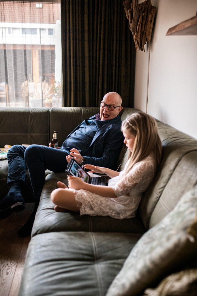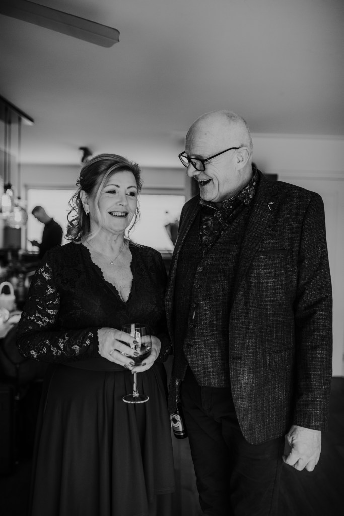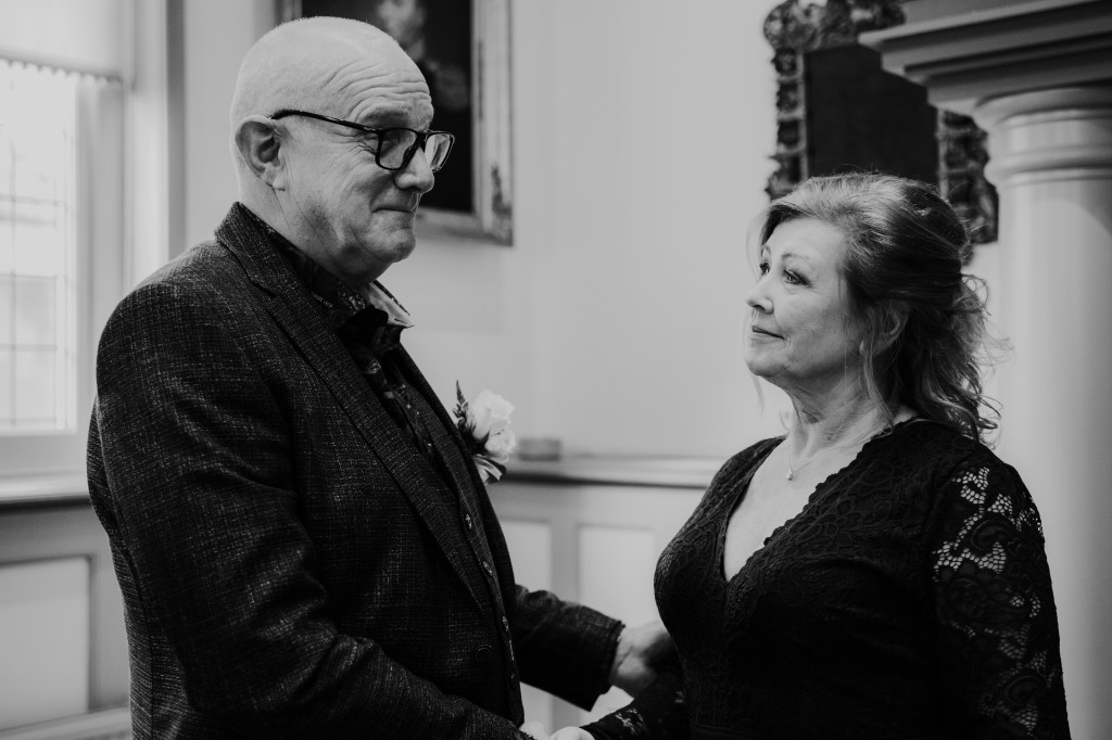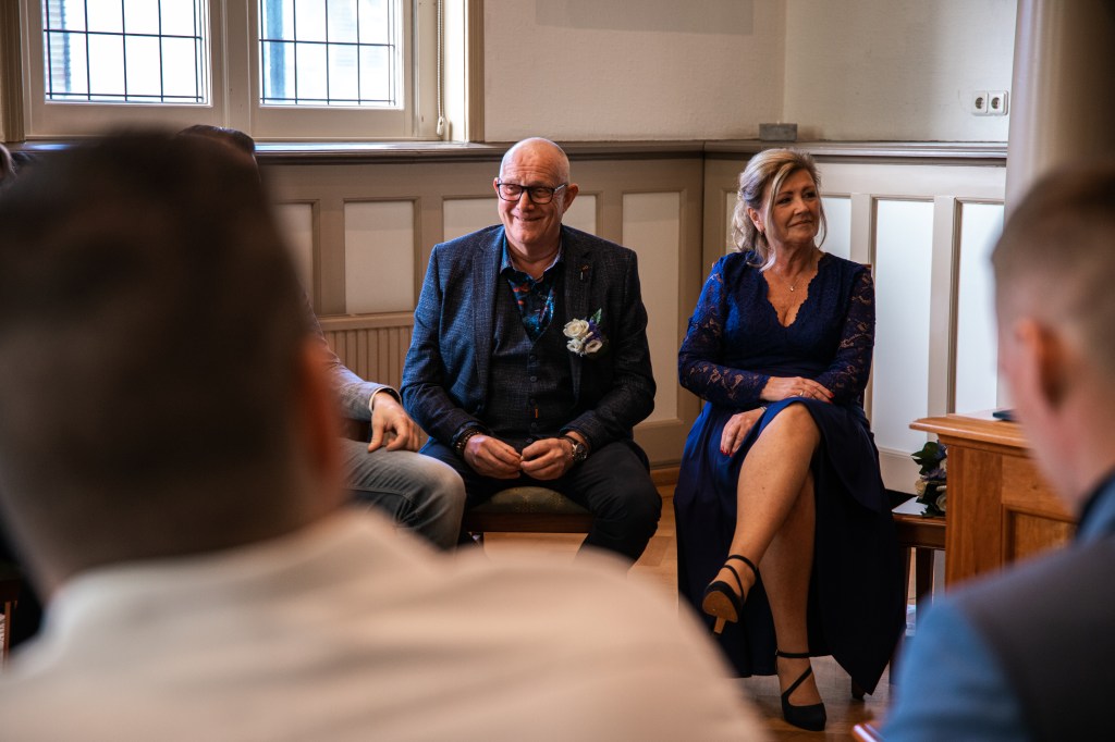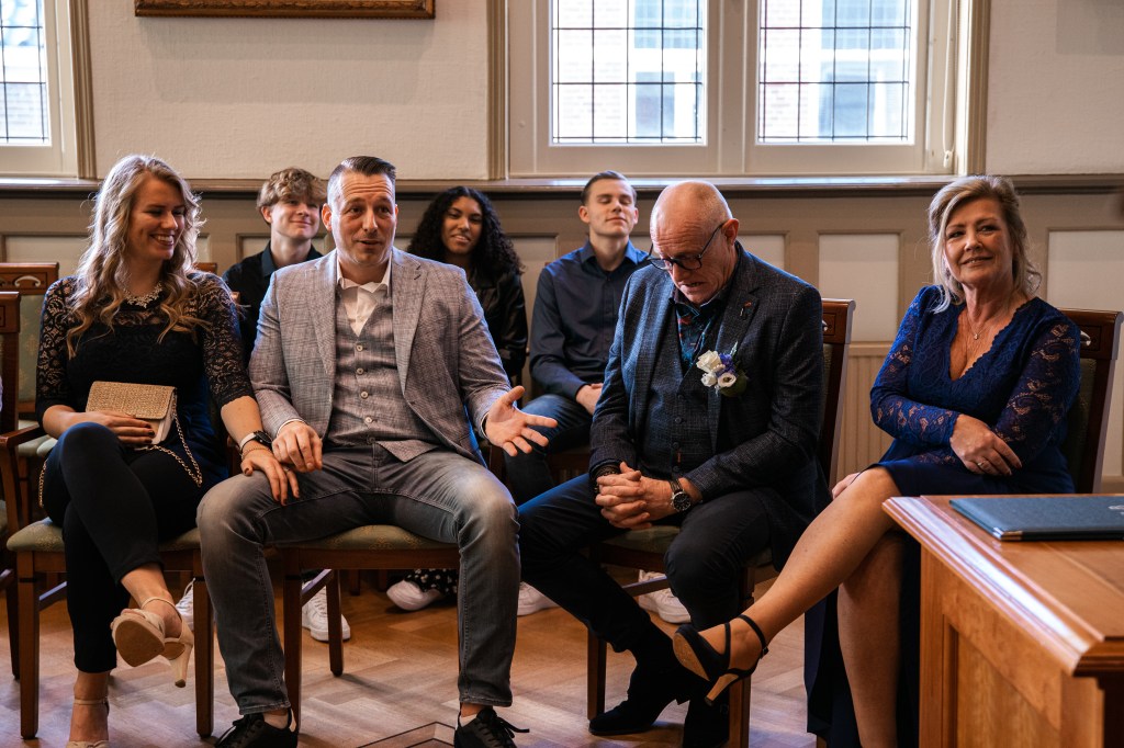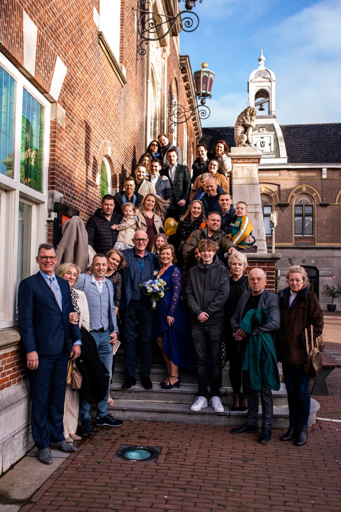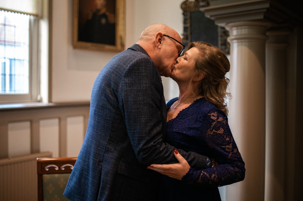 De statige trap op, door de grote deuren richting de trouwzaal. Mevrouw van Raaij, de ambtenaar van de burgerlijke stand, staat ons al op te wachten. Als iedereen zit, maken Eric en Monique hun entree. Wat volgt is een ceremonie vol liefde – en vooral humor. Het verhaal over Eric die ooit languit in de vijver lag, komt terug in elk van de speeches. De kinderen vertellen hun verhalen vol warmte en knipogen. Technologie en het lot brachten deze twee mensen samen, en omringd door hun dierbaren beklinken ze vandaag hun liefde. Met een ferme klap van de hamer, geslagen door Eric’s kleinzoon, is het officieel: meneer en mevrouw IJntema. Gefeliciteerd!