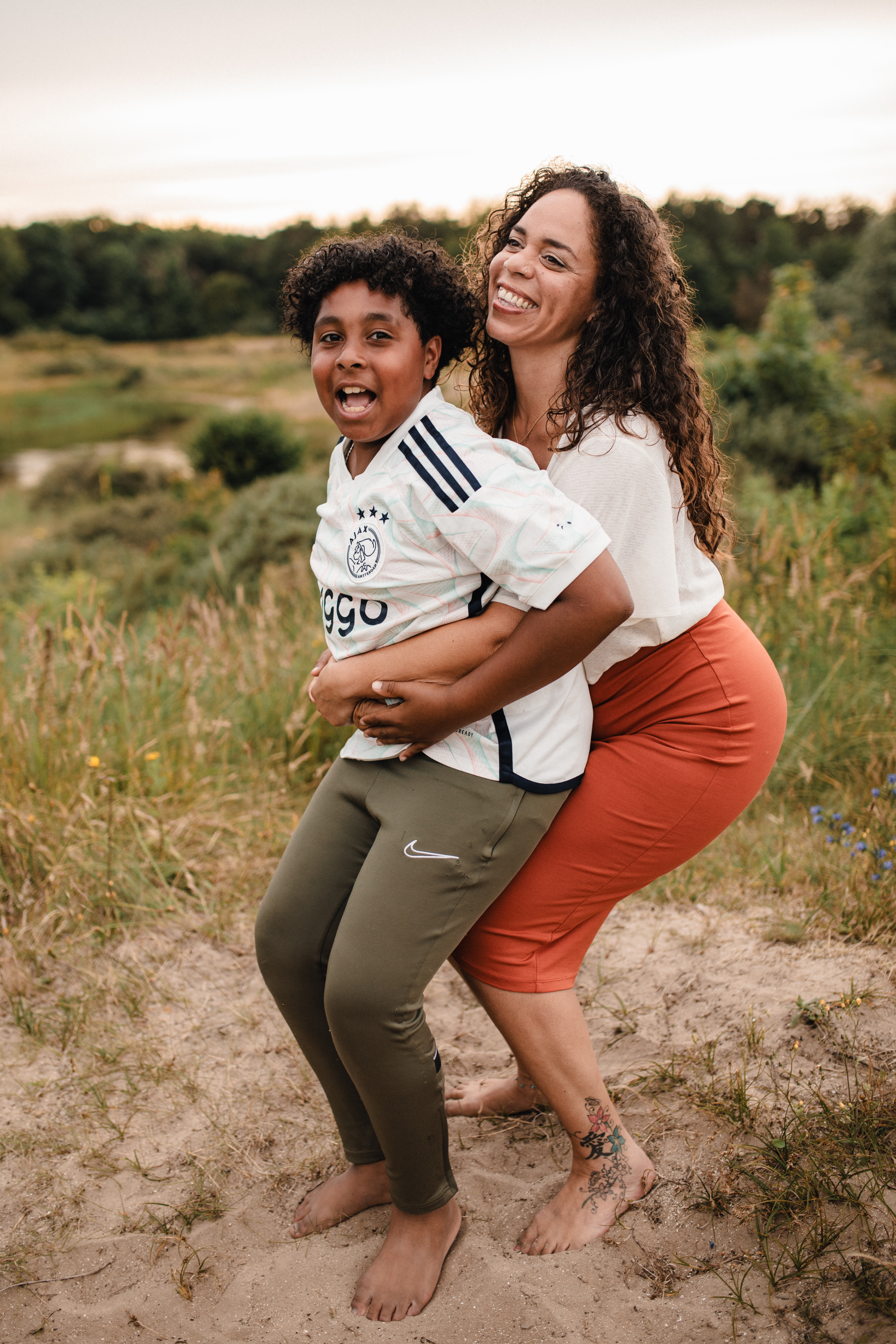 Waar de jongste meteen enthousiast was over de fotoshoot, vond de oudste het eigenlijk maar een hoop gedoe. Gelukkig vonden we ons plekje in de bloeiende duinen, met het zonnetje dat langzaam onderging.